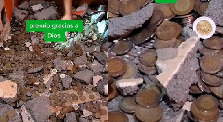 Hace unos días, comenzaron a viralizarse dos videos en los que dos albañiles están dentro de una casa y en el piso puede observarse mucho escombro y varias monedas de pesos mexicanos de diferentes denominaciones.