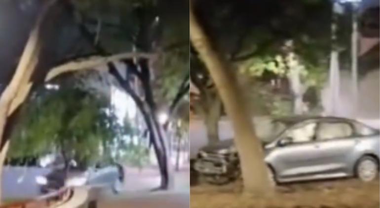 Durante una de estas maniobras, el vehículo subió al camellón central y terminó chocando contra un árbol, quedando detenido en el área verde.