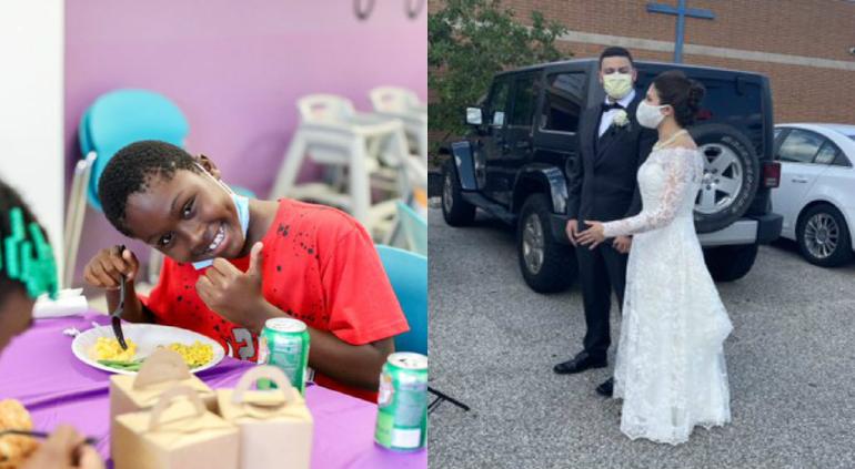When Melanie and Tyler's formal wedding reception was canceled due to COVID-19, they decided they not only wanted to donate their reception food to our guests at Laura's Home, but also to serve the meal in their gown and suit! pic.twitter.com/kKFVx0RO6O