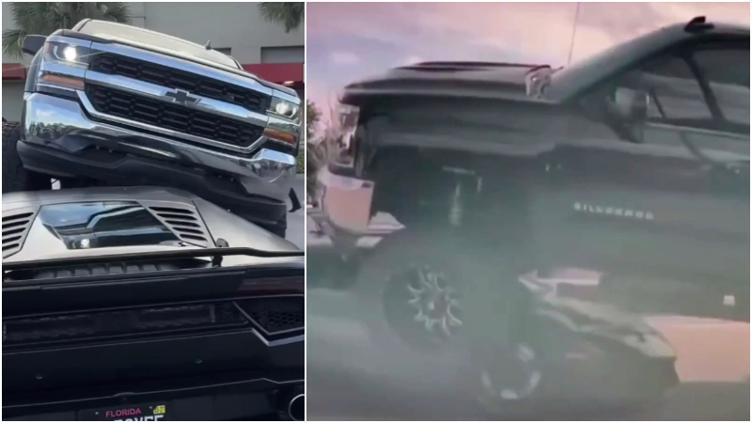 A Florida woman in a lifted Silverado just drove over a Lamborghini in a parking lot.