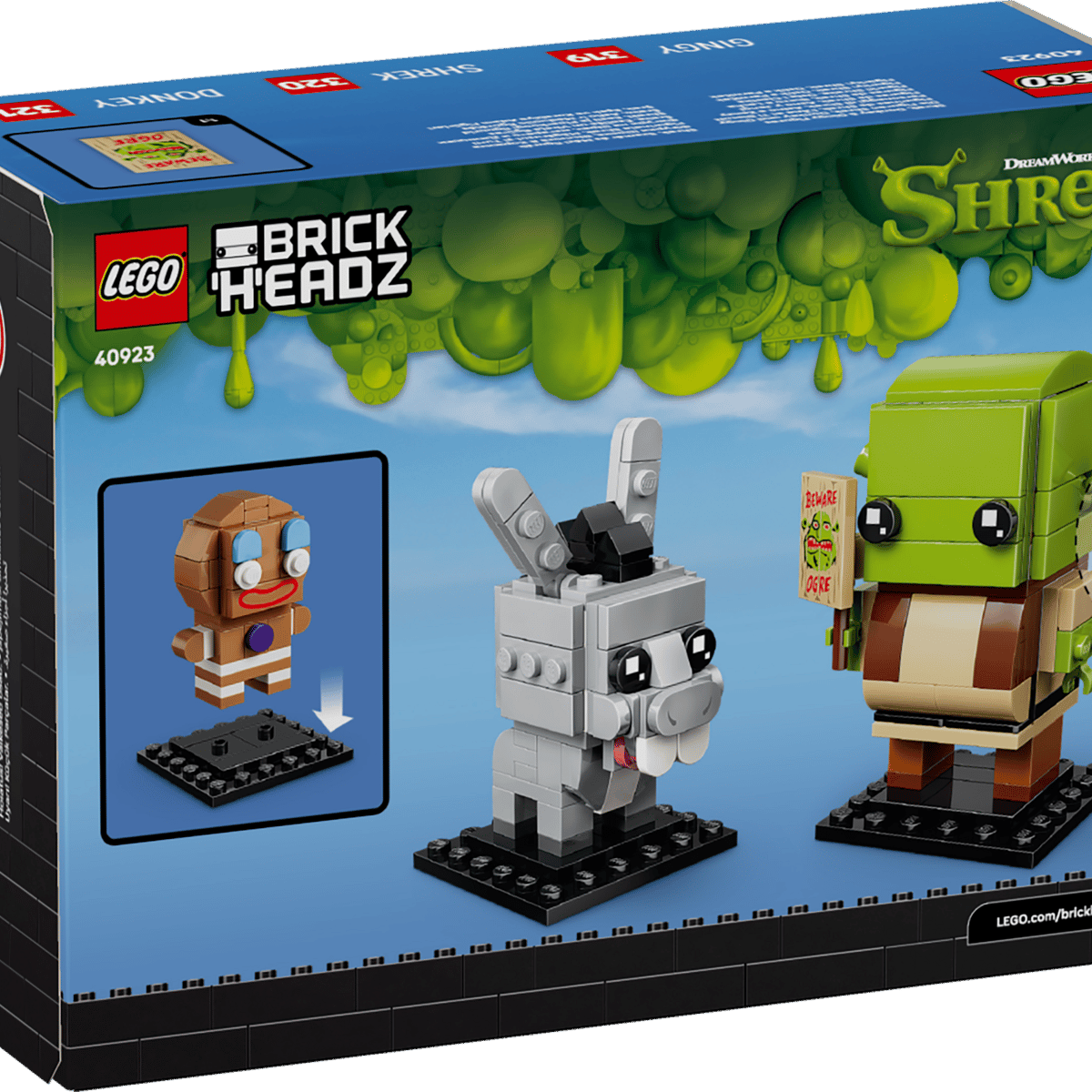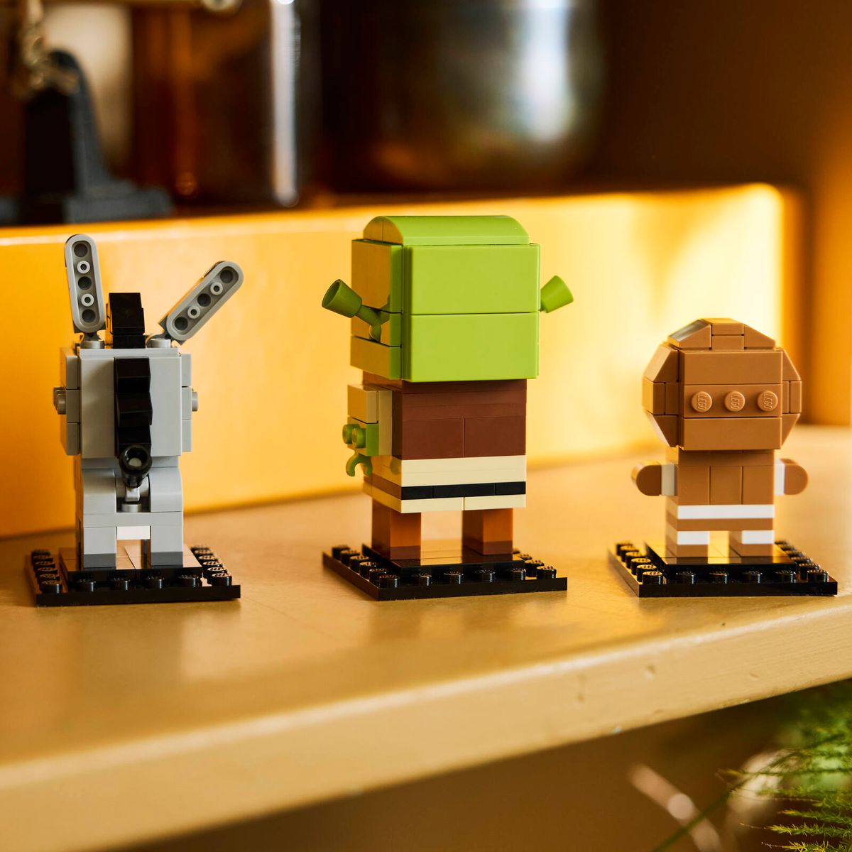 Por su parte, el set LEGO BrickHeadz permitió a niños mayores de 10 años construir versiones estilizadas de Shrek, Burro y Jengi, manteniendo el diseño característico de esta línea.