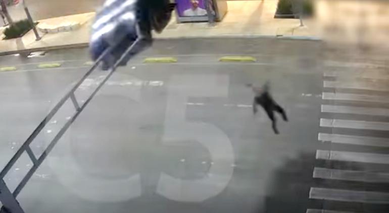 Cámaras de vigilancia del C% captaron el momento en el que su paracaídas queda atrapado en un semáforo y a lo que rápidamente, personas en el lugar se apresuran a auxiliarlo y liberarlo.