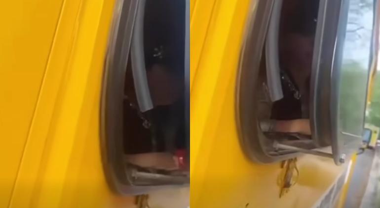 A través de redes sociales compartieron el video de una pequeña que estaba atrapada a bordo de un camión de transporte escolar del kinder Fernando Montes de Oca, en Santa Catarina, Nuevo León.