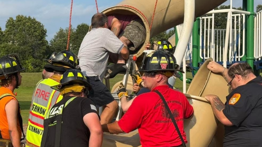 Un hombre de 40 años quedó atrapado en un tobogán infantil en Estados Unidos y fue rescatado por bomberos tras cortar parte de la estructura para liberarlo.
