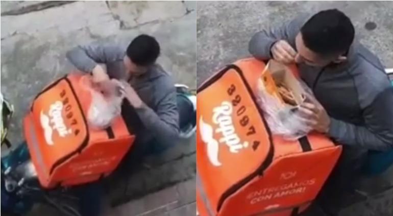 En el video compartido en redes sociales, se puede ver a un joven sobre su motocicleta que abre la mochila de Rappi y saca una bolsa con comida, abre una caja y come algunas papas fritas.