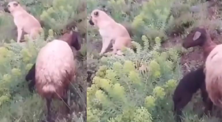 En el video, se ve un perro de tamaño mediano junto a una gran oveja que se encuentra parada cuidando a un pequeño cordero, el cuál parece tener poco tiempo de haber nacido ya que casi no camina.
