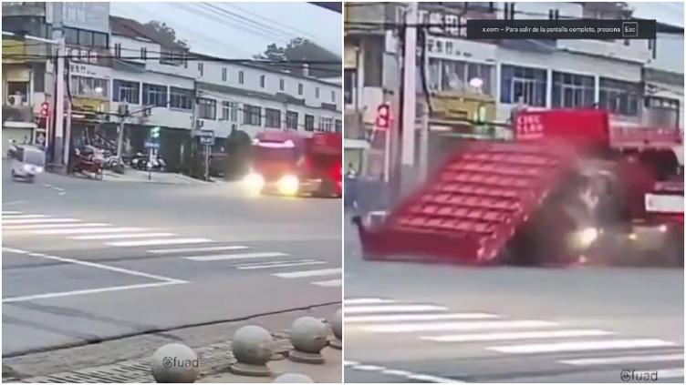 En el video tomado por una cámara de seguridad, se puede ver el momento en que un pequeño auto circula por la calle tranquilamente hasta que un tráiler que se acercaba decide pitarle para que se detenga.