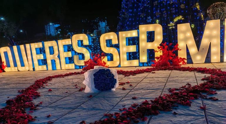La propuesta, que tuvo lugar en la plaza principal, incluyó un gran letrero con la pregunta: “¿Quieres ser mi esposo?”.