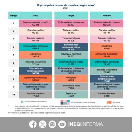 “Las enfermedades del corazón, la diabetes mellitus y los tumores malignos fueron las tres primeras causas de defunción a nivel nacional, tanto para mujeres como para hombres”, describe Inegi.