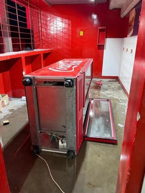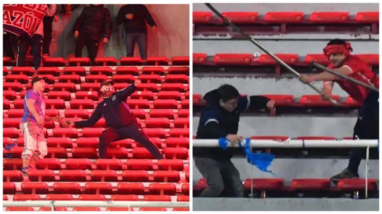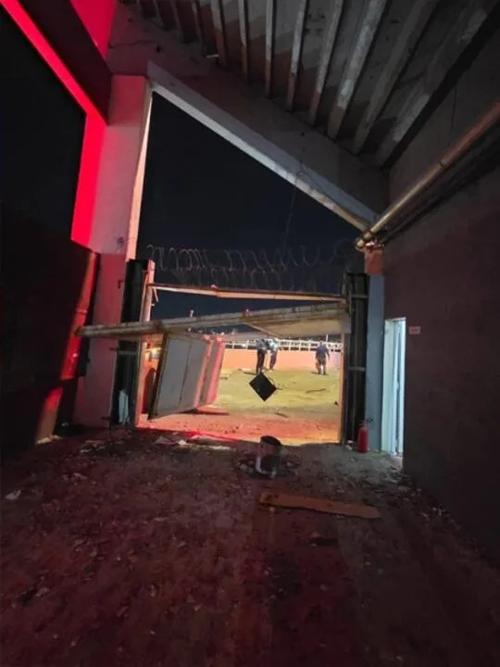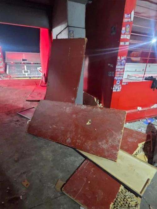 Entre los objetos que tiraban desde la tribuna alta había: partes de inodoros que fueron rotos, chapas, maderas, caños y también las butacas. Cabe señalar que hay luminaria dañada y arrojada al piso. También destrozaron el kiosco que está ubicado en ese sector del estadio con heladeras.