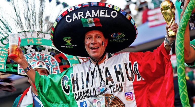 Con su sombrero charro y una bandera de México, Caramelo asiste para apoyar a la selección de México, y ha recorrido muchos países por lo mismo.