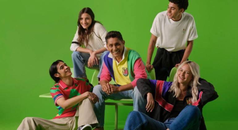 La línea incluye más de 20 prendas y accesorios como chamarras, playeras, shorts y gorras, destacando por sus colores llamativos característicos.