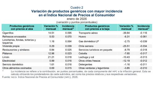 Luego, mostró en una tabla los productos genéricos que tuvieron mayor incidencia a la alza en la inflación entre el 1 y 31 de enero: