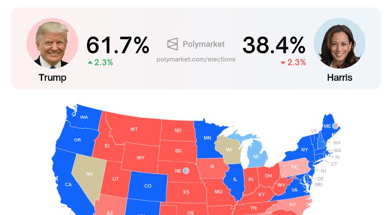 De acuerdo con Polymarket, Donald Trump tiene un 61.7% de posibilidades de ganar las elecciones, superior al 38.4% para Kamala Harris.
