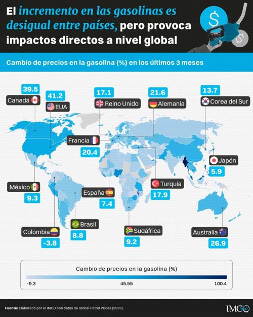 El Instituto Mexicano para la Competitividad, A. C. (IMCO) indicó que este impacto al precio de la gasolian difiere en cada país, pues mientras que en Estados Unidos y Canadá el incremento fue cercano al 40%, en México fue de 9.3%.