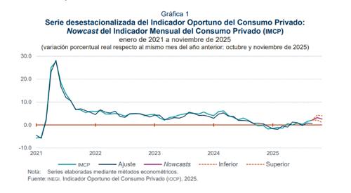 Para octubre de 2025 y a tasa anual, el IOCP anticipa un avance del 2.6% en el IMCP. A tasa mensual la variación sería del -0.1%, pues sería inferior al resultado de octubre.