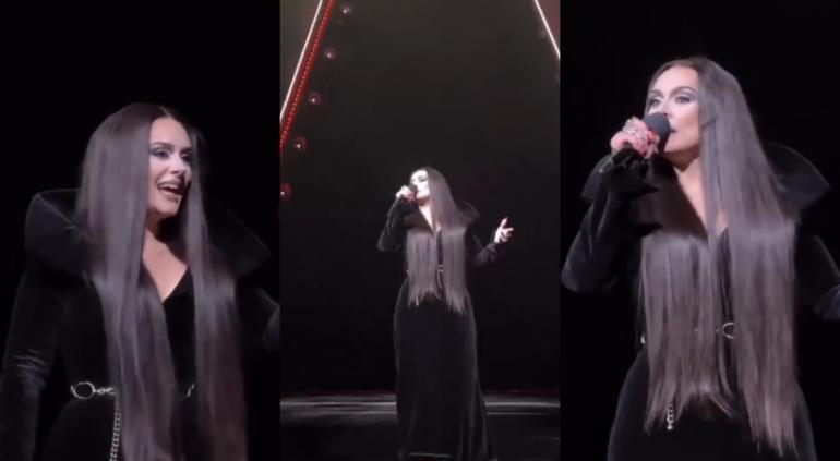 La excepción no fue anoche, pues la cantante apareció con una larga cabellera negra y un vestido del mismo color, en donde rememoró a Morticia, uno de los personajes más queridos de esta festividad.