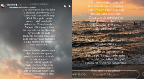 A través de sus historias Fer escribió que fue la mañana del 25 de diciembre que su bebé perdió la vida, agregó que han sido días muy difíciles para ella pero dijo estar agradecida con Dios por el tiempo que estuvo junto al pequeñito a pesar de que fueron solamente dos meses y medio.