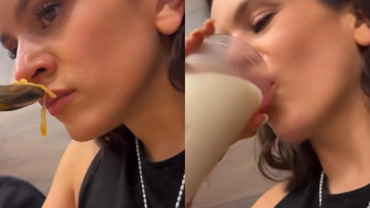 Al saborear el pozole, Rosalía expresó divertida: “Primera vez que como pozole, chicos. Huele bien. Pica, es traicionero, pica, pero está muy bueno. Me gusta, me sorprende que tenga lechuga, está muy bueno, me ha gustado, me ha encantado.”