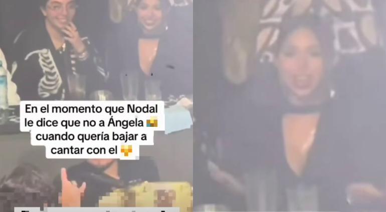 En las imágenes se puede observar el momento en que Ángela estaba a punto de pararse a cantar y Nodal logra verla en ese instante le dice que no con la mano.