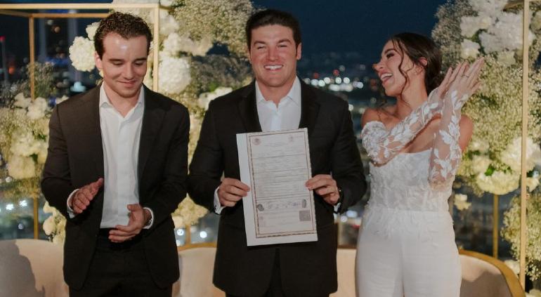 Pero unos días antes se efectuó el enlace civil en una ceremonia íntima que fue oficiada por el hermano de la novia, el gobernador de Nuevo León, Samuel García.