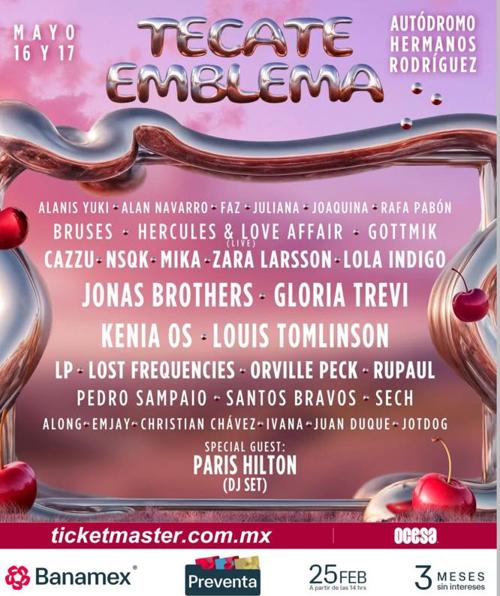 Fue revelado el line up del Tecate Emblem 2026 y las sorpresas no pararon, desde Jonas Brothers, Kenia Os y Louis Tomlinson hasta la invitada especial Paris Hilton.