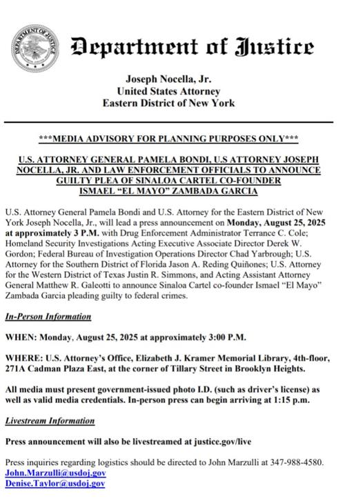 Pam Bondi, la fiscal General de Estados Unidos, ofrecerá una conferencia de prensa la tarde de este lunes, luego de la audiencia en la que Ismael "El Mayo" Zambada, confundador del Cártel de Sinaloa, se declararía culpable.