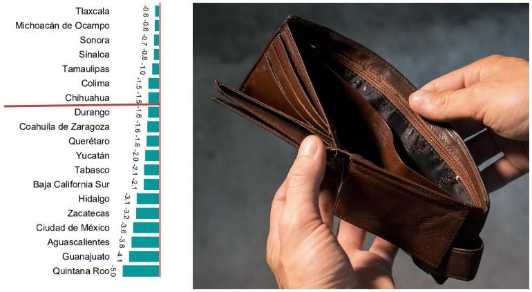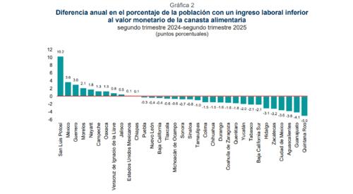 En el lado opuesto, en San Luis Potosí aumentó la población en pobreza laboral 10.2 puntos, Estado de México; 3.6 puntos, y Guerrero; 3.0 puntos.