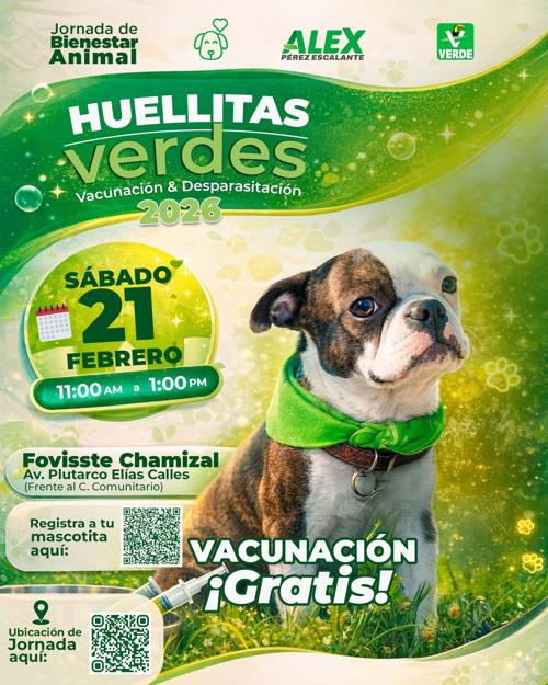 De 11:00 a 13:00, la Jornada Bienestar Animal ofrecerá vacunación y desparasitación gratuitas para mascotas en Fovissste Chamizal; registro por QR solicita datos personales y de la mascota.