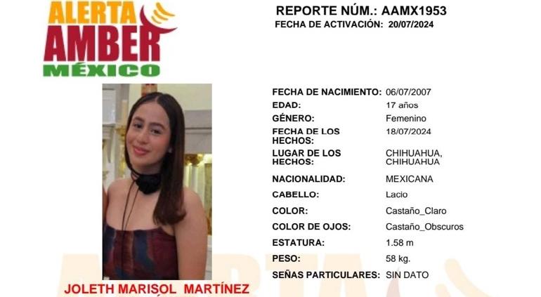 Autoridades activaron la Alerta Amber, por la desaparición de la menor de edad Joleth Marisol Martínez Rodríguez, quien fue vista por última vez el 18 de julio en la ciudad de Chihuahua.