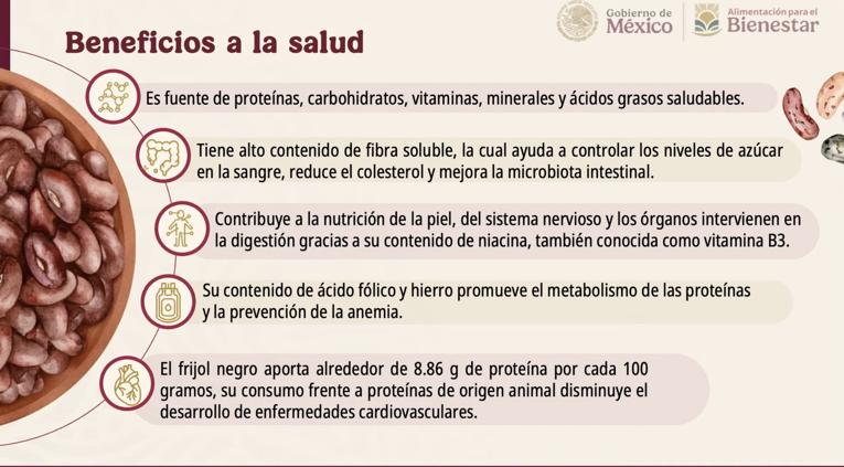 Albores destacó que el frijol es fuente de proteína, fibra, vitaminas, minerales y ácidos grasos, contribuye a reducir colesterol, estabilizar azúcar en sangre y prevenir anemia. “El frijol es bendito para la salud del pueblo de México”, afirmó.