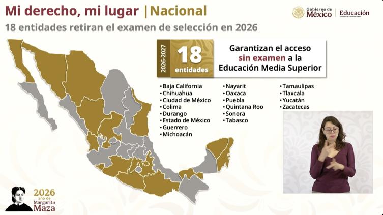 Durante la presentación del modelo de Bachillerato Nacional, la funcionaria detalló que 18 estados ya aplican un esquema de ingreso sin examen, como parte de la transformación educativa impulsada por el gobierno federal.