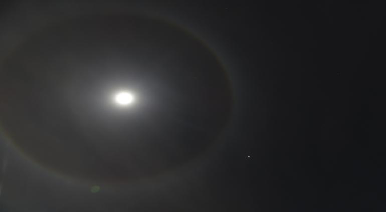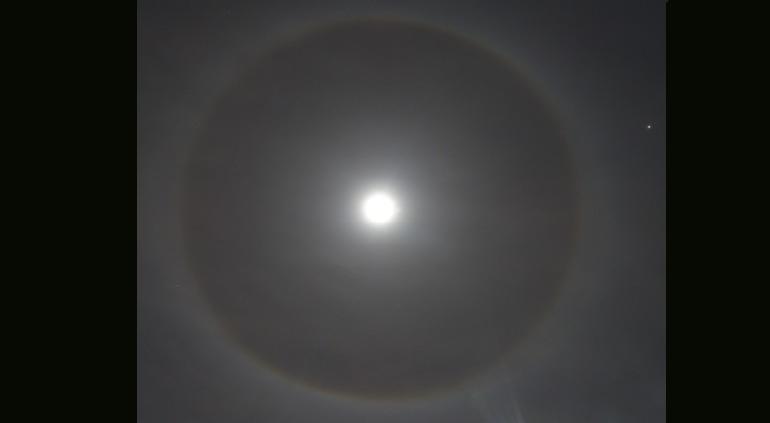 El nombre de este suceso es Halo Lunar, y es una refracción de la luz solar filtrada por la Luna que choca con la nubosidad en la atmósfera.