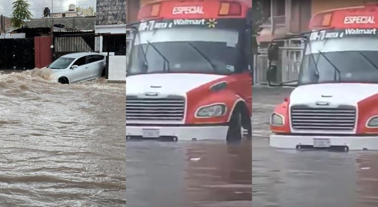Internautas informaron sobre un automóvil que fue arrastrado por las aguas acumuladas por las fuertes lluvias, como también de un camión que quedó varado en la calle José María Mata, en la colonia Infonavit.