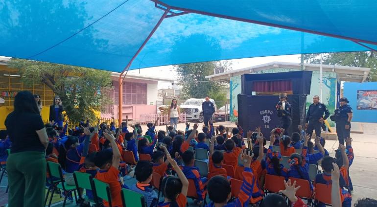 Elementos de la Policía Municipal llevaron función de títeres a estudiantes del kínder Vicente Suárez.