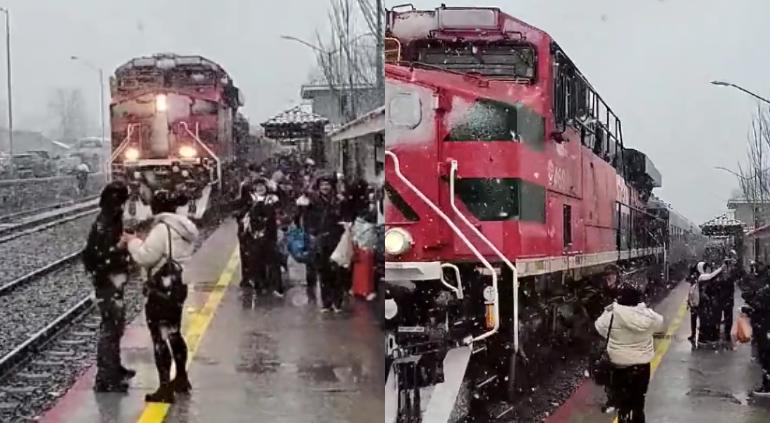 Esta mañana turistas que se encontraban en la estación del Chepe en Creel lograron captar el arribo entre la nevada.