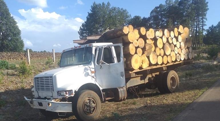 Elementos de la Agencia Estatal de Investigación Zona Sur, realizaron el aseguramiento de un camión cargado con madera en Guachochi, misma que fue talada de forma clandestina.