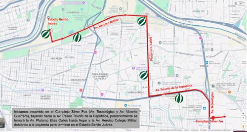 El recorrido de la caravana comenzará en el Complejo Silver Fox ubicado en la avenida Vicente Guerrero con rumbo al norte, para luego tomar la avenida Paseo Triunfo de la República hasta la avenida Plutarco Elías Calles, de donde continuará hasta la avenida Heroico Colegio Militar para finalizar en el Estadio Olímpico Benito Juárez.