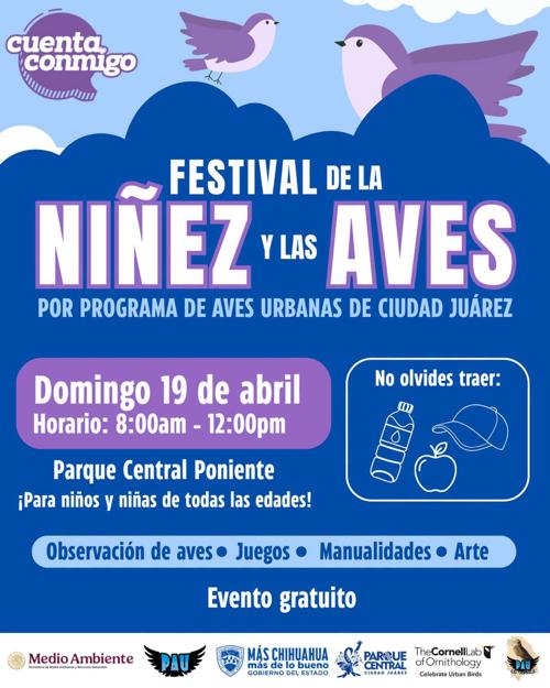 El Parque Central invita a la ciudadanía juarense a participar en el Festival de la Niñez y de las Aves, que se llevará a cabo este domingo 19 de abril en un horario de 8:00 de la mañana a 12:00 del mediodía en el lado poniente.