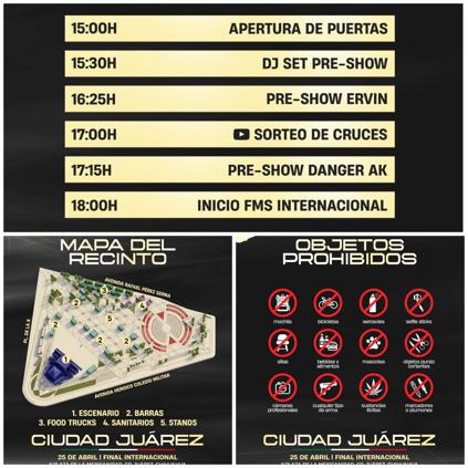 La Final Internacional de FMS se llevará a cabo este sábado 25 de abril en la Plaza de la Mexicanidad mejor conocida como la X, en Ciudad Juárez, donde se espera la llegada de cientos de fanáticos del freestyle.