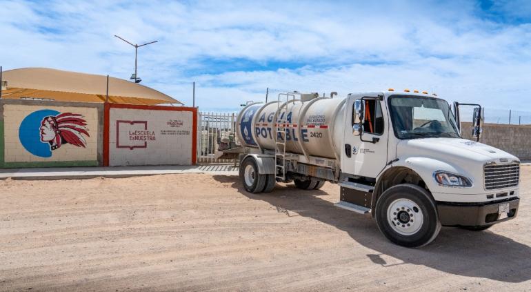 La Junta Municipal de Agua y Saneamiento de Juárez mantiene el suministro gratuito de agua potable a escuelas ubicadas en la zona de los kilómetros, beneficiando a estudiantes de distintos niveles educativos.