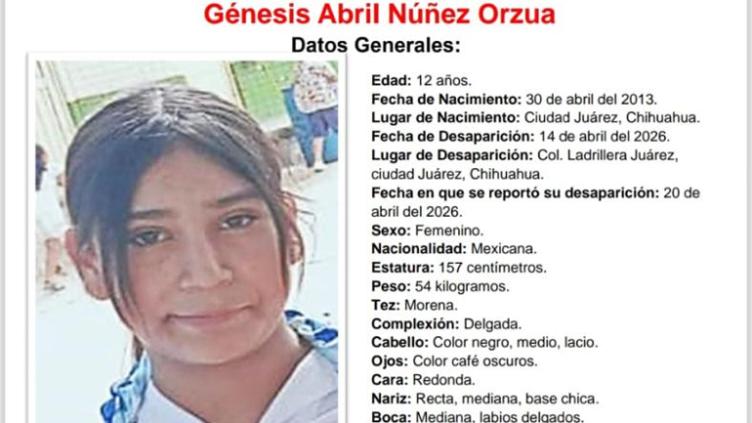 Génesis Abril Núñez Orzua de 12 años fue reportada como desaparecida desde el 14 de abril del 2026 en en la colonia Ladrillera Juárez en Ciudad Juárez.