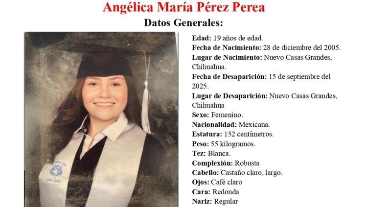 La Fiscalía General del Estado emitió una alerta para localizar a Angélica María Pérez Perea, de 19 años, quien fue vista por última vez el 15 de septiembre de 2025 en el municipio de Nuevo Casas Grandes, Chihuahua, y desde entonces se desconoce su paradero.