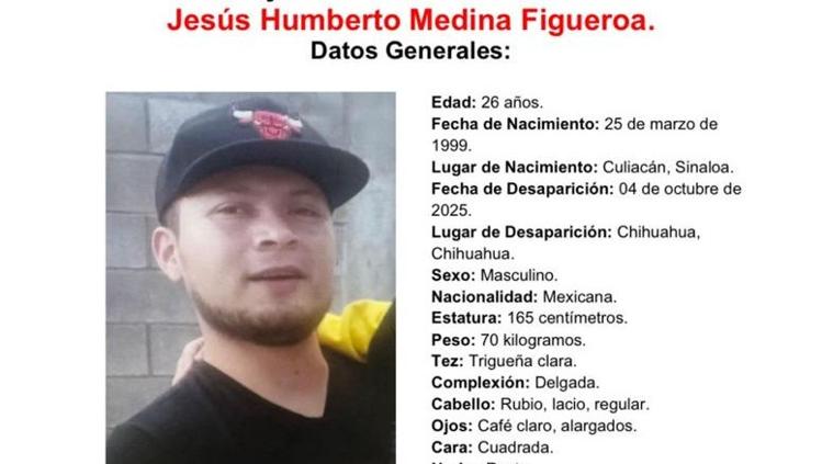 La Fiscalía General del Estado emitió una ficha de búsqueda para localizar a Jesús Humberto Medina Figueroa, de 26 años de edad, quien fue reportado como desaparecido el pasado 4 de octubre de 2025 en la ciudad de Chihuahua.
