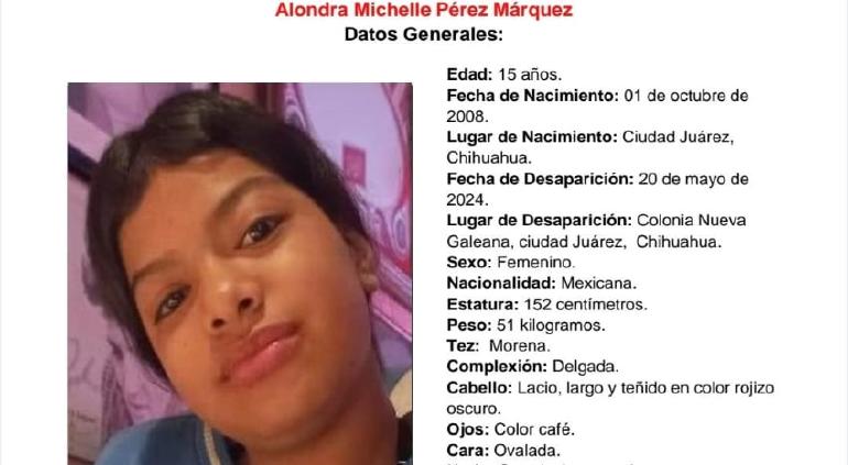 La Fiscalía General del Estado solicitó apoyo de la comunidad para localizar a Alondra Michelle Pérez Márquez, de 15 años de edad, quien desapareció hoy 20 de mayo en la colonia Nueva Galeana.