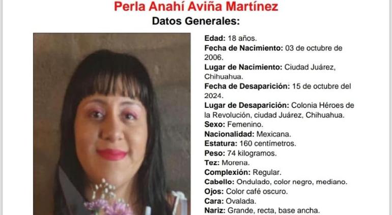 Perla Anahí Aviña Martínez de 18 años de edad fue vista por última vez el martes 15 de octubre del 2024 en la colonia Héroes de la Revolución en Ciudad Juárez.