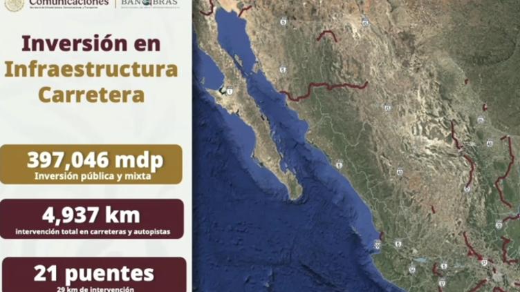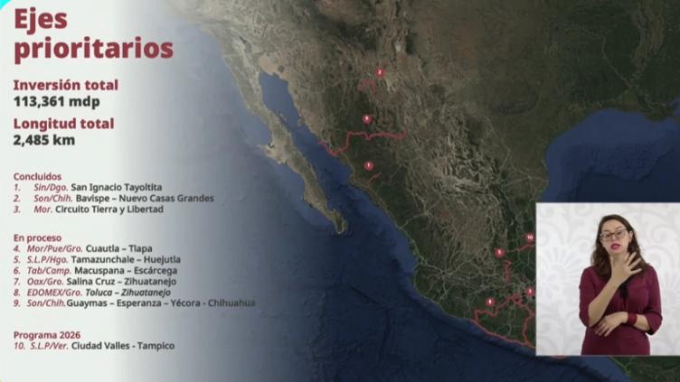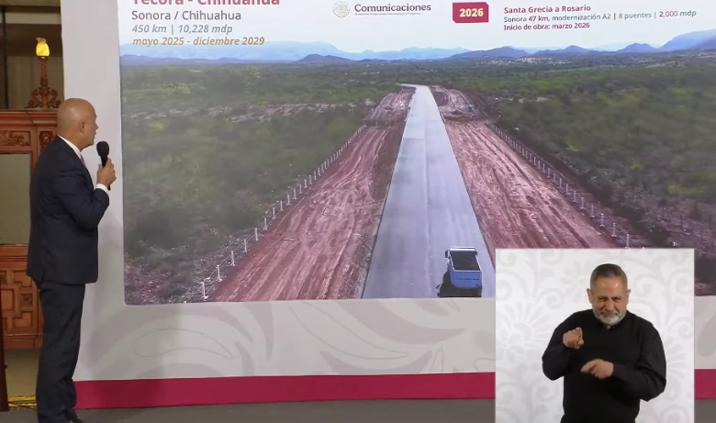 En Ejes Prioritarios, el titular de la SICT, Jesús Esteva Medina, destacó que entre las obras ya concluidas se encuentra la carretera Bavispe–Nuevo Casas Grandes, proyecto que conecta Sonora con el estado de Chihuahua por el norte.