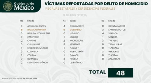 El reporte resaltó dos entidades federativas: Baja California y Guerrero, con cinco y seis víctimas reportadas por delito de homicidio.