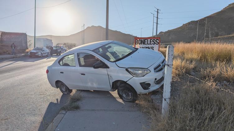 Esta mañana se registró un accidente vial en el cruce de la calle 38 y el Periférico R Almada. Un conductor que transitaba de este a oeste a bordo de un Dodge Attitude color blanco perdió el control al tomar la lateral para girar a la derecha hacia la calle 38.