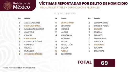 Mientras que a nivel nacional reportaron 69 víctimas de homicidio, lo que está por encima del promedio de lo que va de octubre (53.4), destacaron siete estados por sus altas cifras.